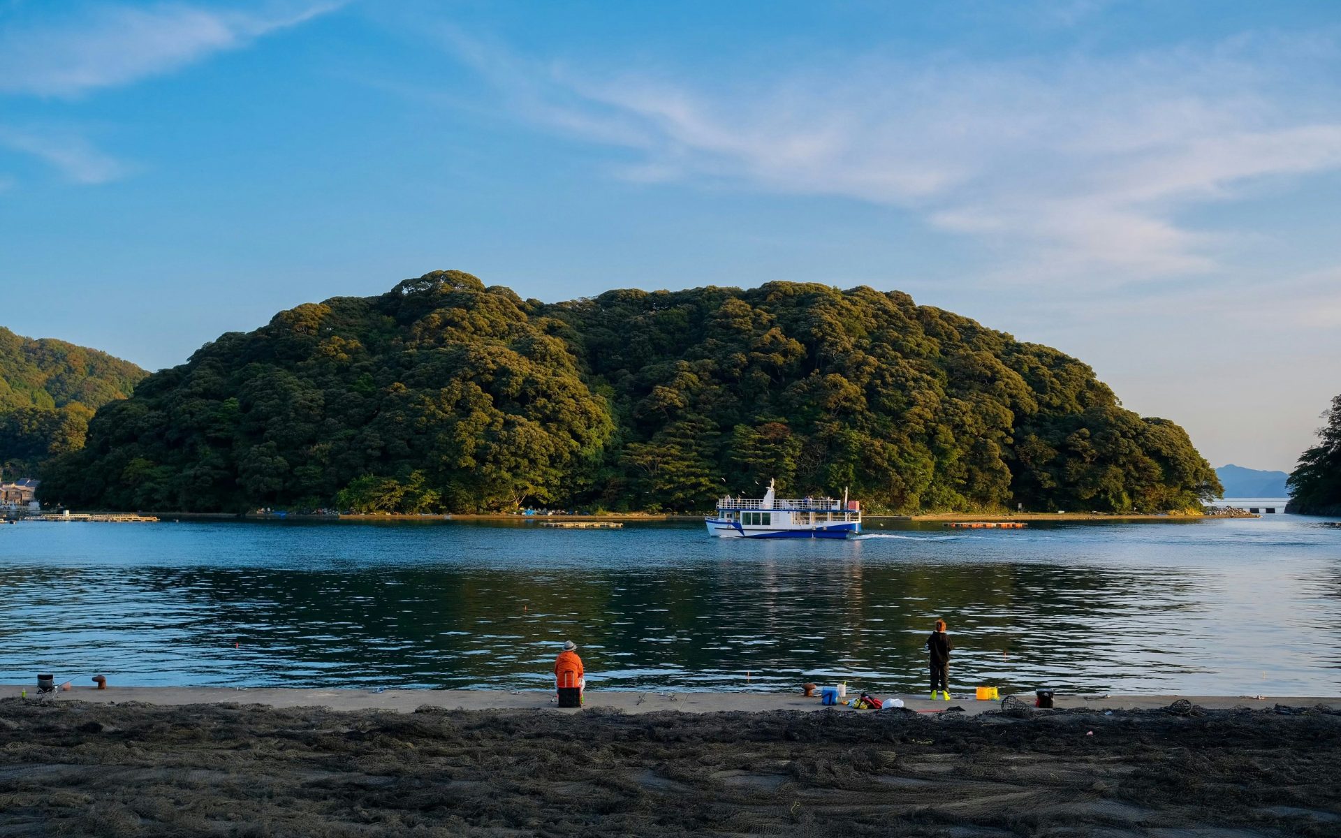 Just as a Buddhist temple overlooks the sandbar’s southern edge, a Shintō shrine stands guard to the north: Motoise Kono-jinja. Shintō is Japan’s Indigenous, animistic religion, in which people pray to the many spirits for good fortune. Buddhism, which was brought to Japan in the sixth century, is focused on attaining enlightenment to transcend the cycle of suffering and rebirth. Japan is very syncretic, with most people observing traditions from both religions, and you’ll often see shrines and temples sharing sites.
