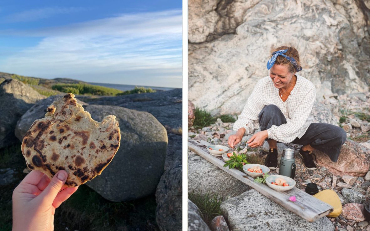 Once shredded and cut, Martinson’s harvest is ready to be assembled. As she prepares the camping stove, I take charge of the bread, kneading fragrant—slightly fishy—kelp flakes into the dough.