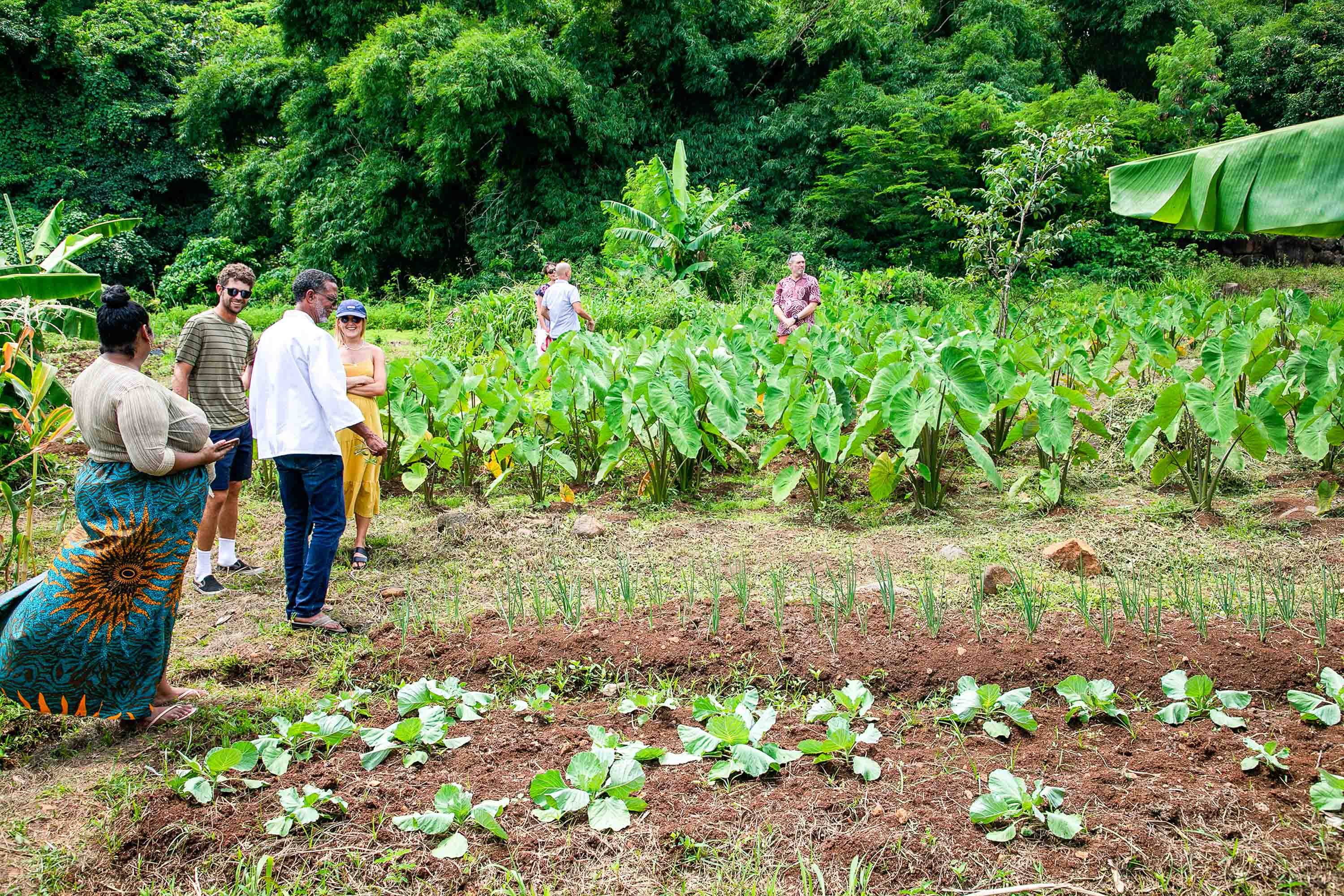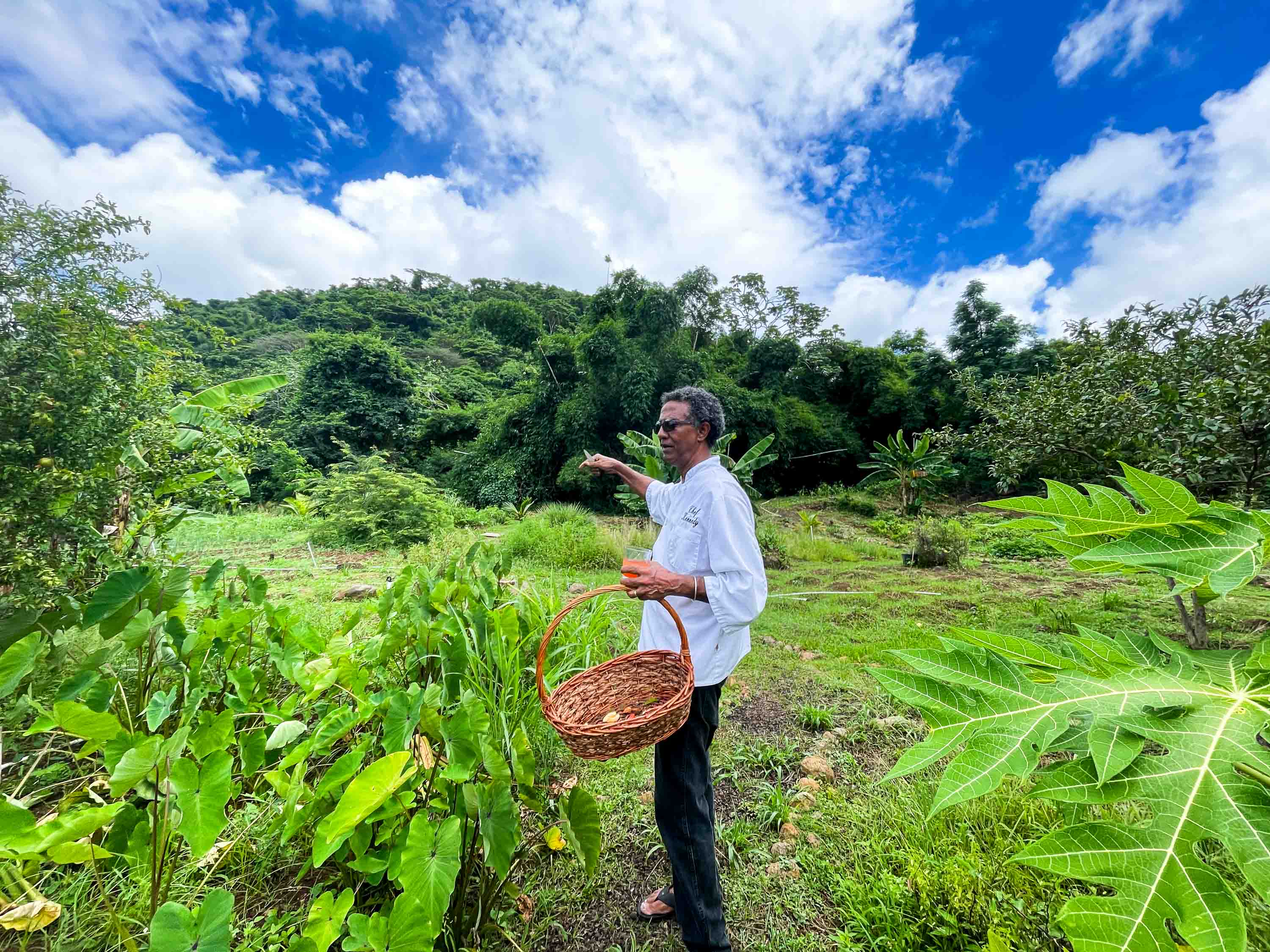 Atroll in the garden reveals those ingredients in the wild: Broad-leaf callaloo, breadfruit, green bananas, and golden, plump seasoning peppers. Immersed in this paradise of tall avocado trees, with spice shrubs up to your knees and palm fronds humming in the breeze, it’s easy to forget the hurricane could have turned the land into a molehill—if the land had been weeded as Roberts had wanted.