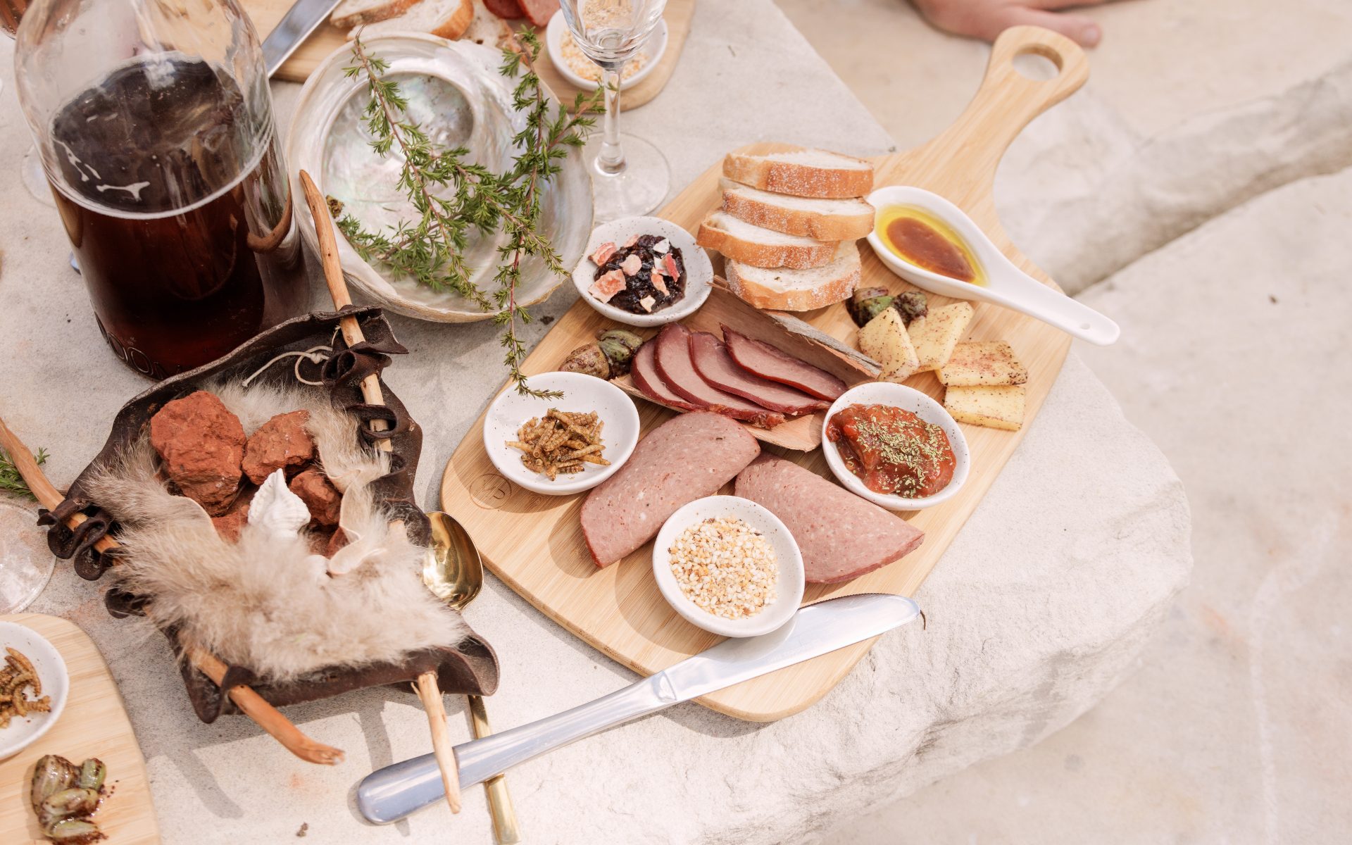 Kitana invites me into the Palawa Kipli kitchen, where chef Braydon Gower has been busy crafting a platter of native flavors for us to share. Among other delicacies there’s smoked wallaby, wallaby salami, a kunzea tomato relish, pepperberry cheese, Tasmanian honey, finger lime jam, and saltbush meal worms.