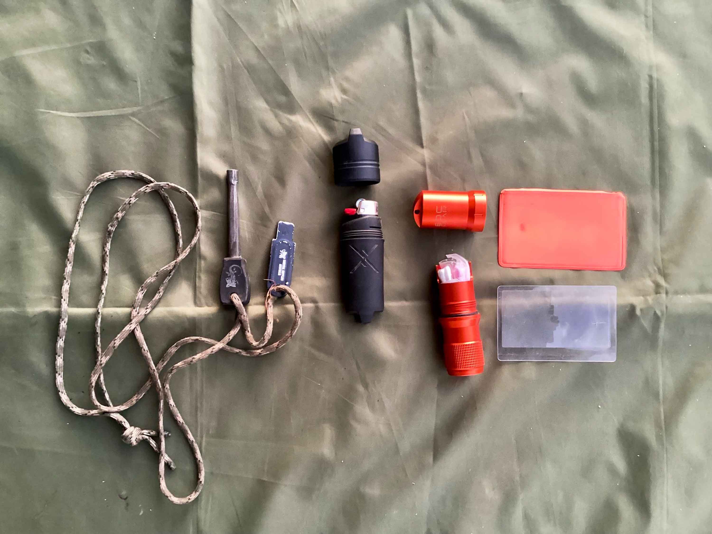 Speaking of water filters, down by the river we learn how to build a fire, using a Ferro rod, knife, and wood, to boil water of its impurities. We learn the types of tree materials best gathered to make fire—dry bark, dead twiggy branches, pencil-thin sticks, and thicker rods for the base. Finding dry bark to make the nest-like tinder bundle was the hardest to source. My hands are getting cuts, and the knife is handy for scraping the bark clean.