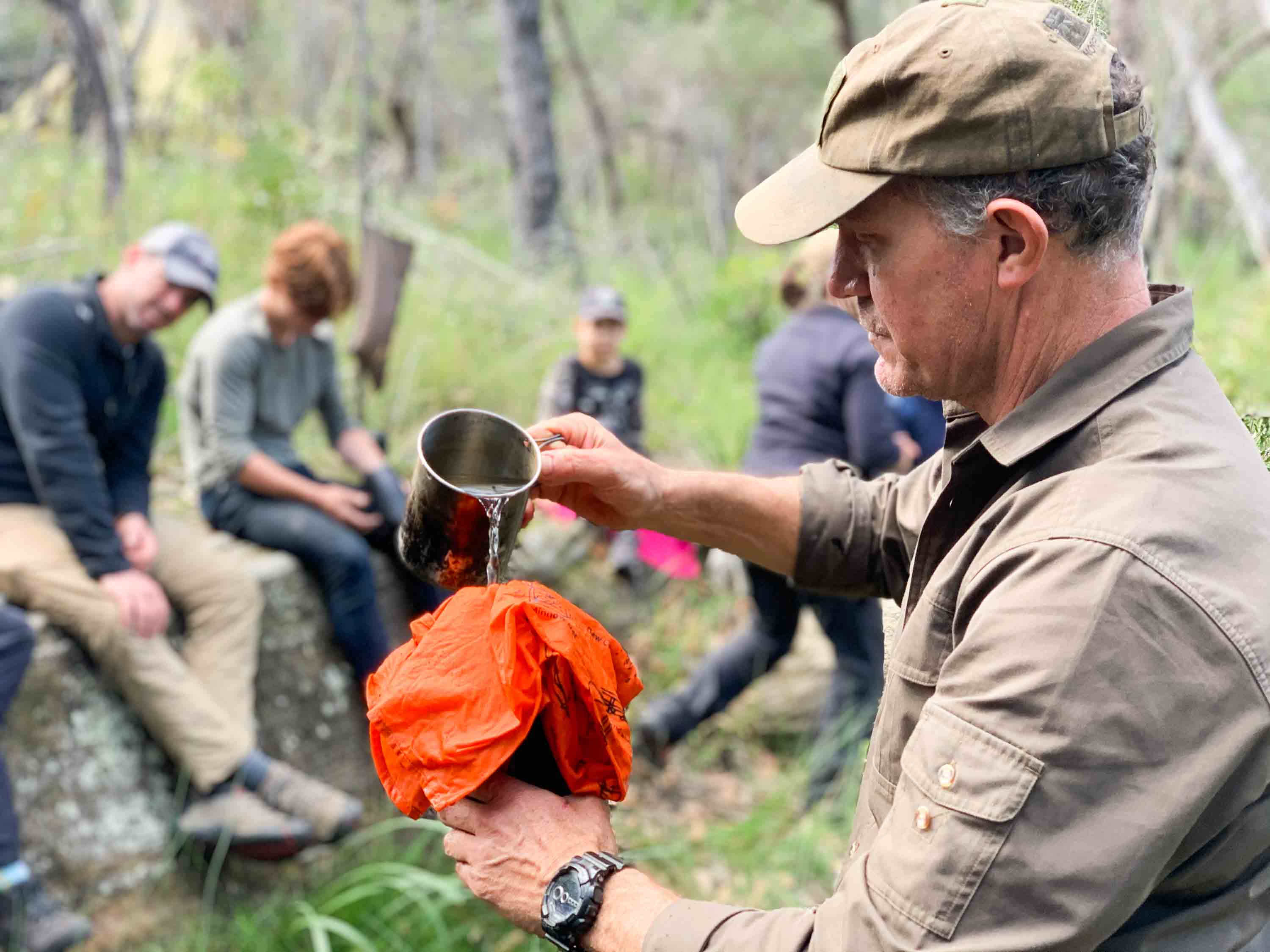 Our ‘classroom’, shaded by an old army parachute, is under the tutelage of BSA founder Gordon Dedman. We’re a group of 20 initiates and we gather around a fire, over which sits a boiling kettle, our source of hot water. This is not a powered site. We’re minimally resourced on purpose.