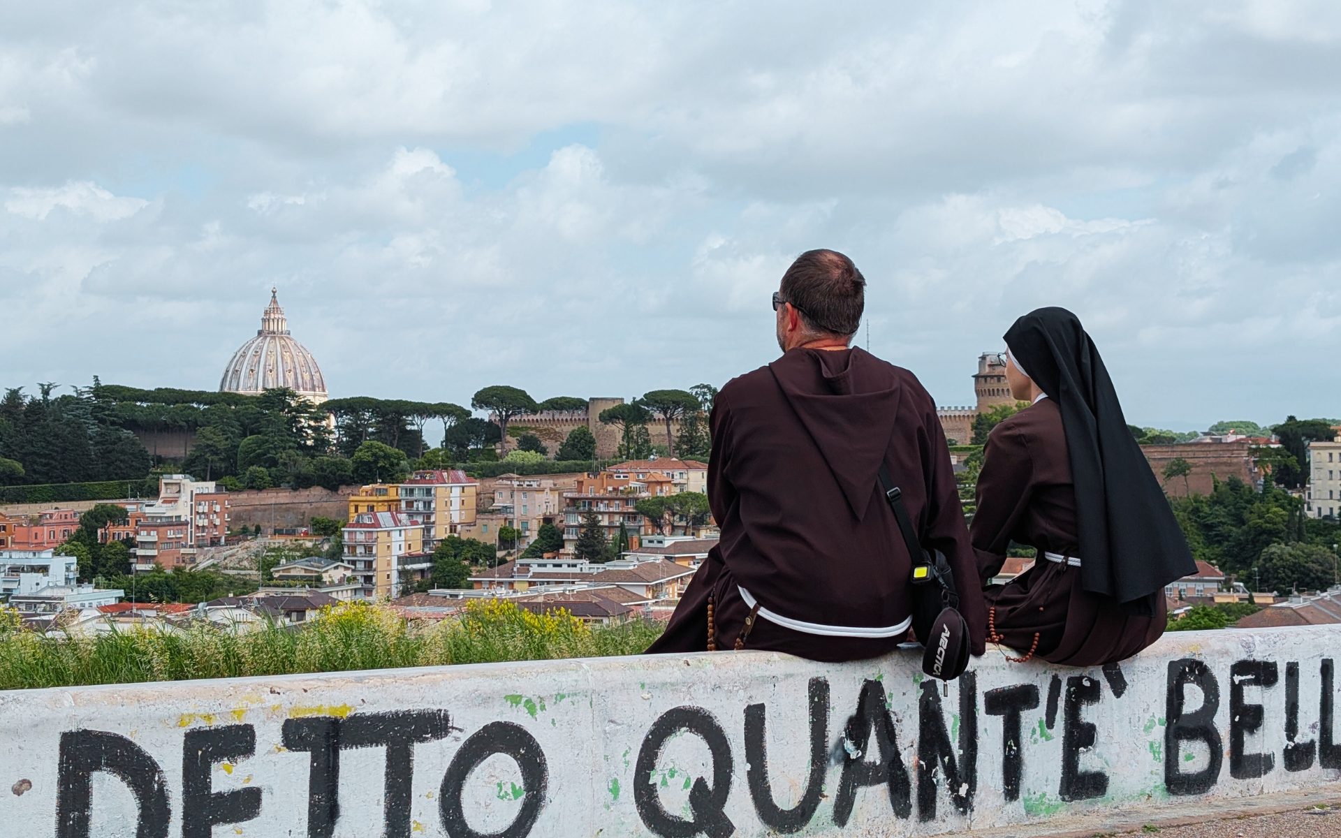 From our vantage, though, the coast was clear. A nun and monk sat together in what I hoped was a moment of forbidden love. The concrete step below them graffitied with: “Tell me how many times you have seen the sky above Rome and said, ‘How beautiful!’”. Nearby, a couple were having a picnic and smoking weed.