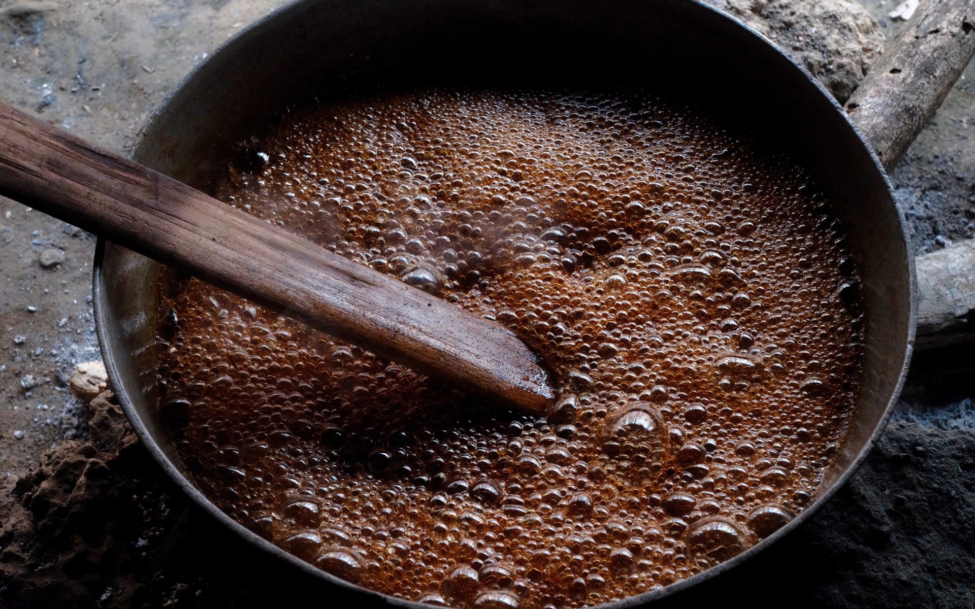 Nearby, a pot bubbles over an open fire and she directs her guests to stir the golden mixture with a long stick. The rising scent hits me immediately: Warm cinnamon, toasted coconut, and the sweetness of sugarcane reducing. It’s the kind of smell that reminds me of Christmas morning, comforting and familiar.